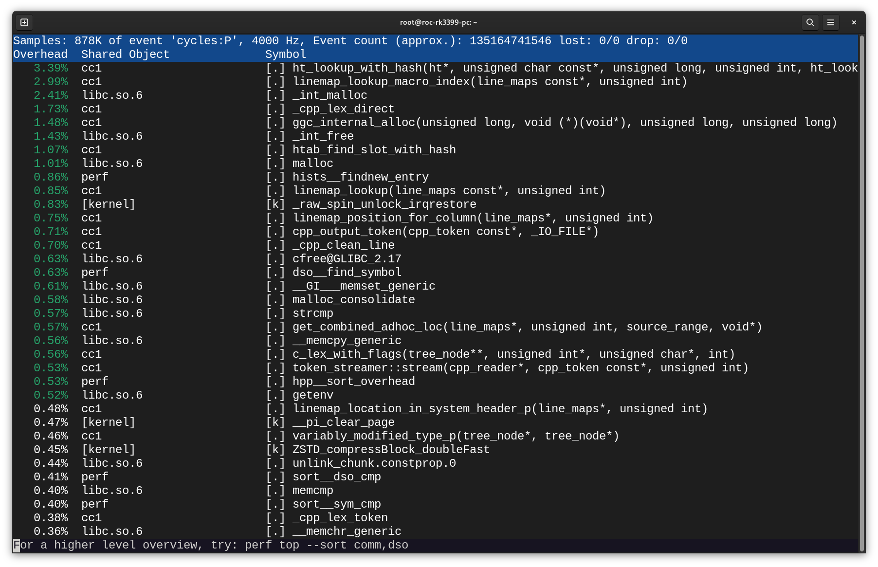 # perf top --hierarchy Samples: 4K of event 'cycles:ppp', 4000 Hz, Event count (approx.): 1006575623 lost: 0/0 + 57.16% cc1 + 19.39% [kernel] + 11.64% libc-2.28.so + 2.08% perf + 1.22% genksyms + 1.16% ccache + 1.05% as + 0.99% ld-2.28.so + 0.86% make + 0.84% libpixman-1.so.0.34.0 + 0.65% bash + 0.41% libelf-0.174.so + 0.32% objtool + 0.24% libglib-2.0.so.0.5800.2 + 0.17% gcc + 0.06% perf-8888.map + 0.03% [i915] + 0.02% [crc32c_intel]